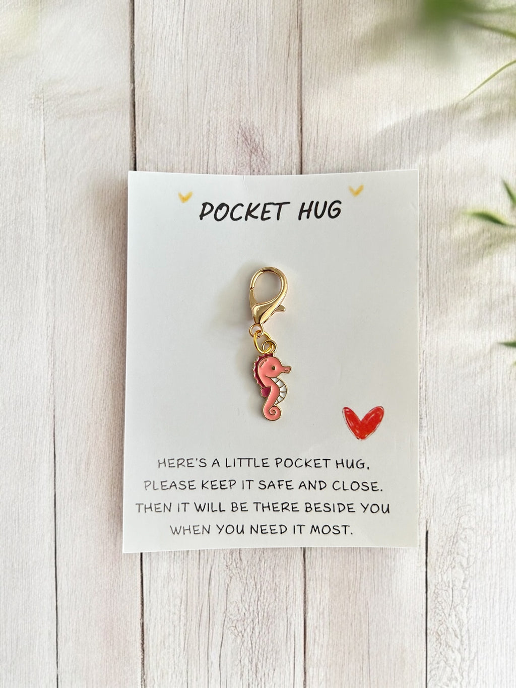 A sweet ocean-themed bundle perfect for anyone who loves seahorses. Inside the natural linen gift bag you’ll find a beautifully designed seahorse journal for thoughts and memories, a cute seahorse keycharm, and a tiny “pocket hug” charm with a note that reads:
